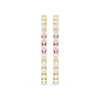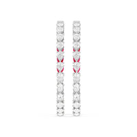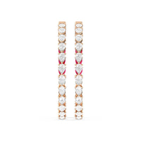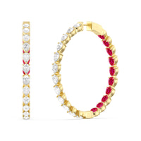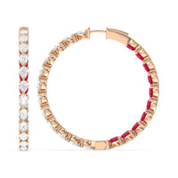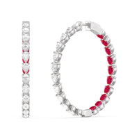 You'll love the way these earrings shine. This highly versatile pair of diamond and created ruby hoops features an inside-out tracing of pear stones. The pear-cut or teardrop-shaped stones offer a mesmerizing play of brilliance and sparkle given their two different ends - one is rounded, the other is pointed. The continuous line of the elongated gem also looks very flattering and feminine, which helps balance the boldness of these big hoop earrings.