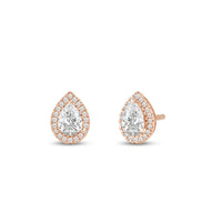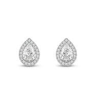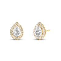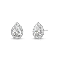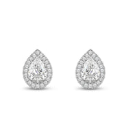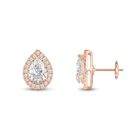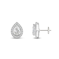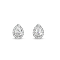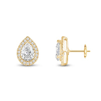 A lovely outfit-maker, this pair of stud earrings is what you need to give any ensemble a polished, put-together finish. It is a trendy pear cut earrings with a stunning halo of round stones encircling the center stone.