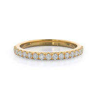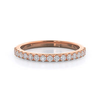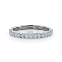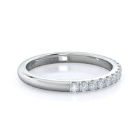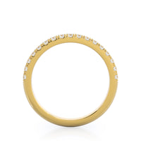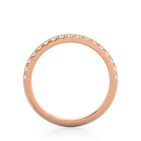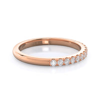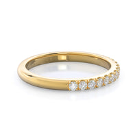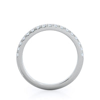 Larger accent diamonds are truly eye-catching additions to this pave wedding band. Scalloped cutouts on the sides of the matching wedding band allow more light into the stones, ensuring their sparkle with do justice to your pear shaped diamond and its halo that sits just above.