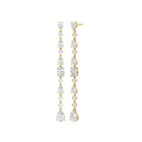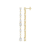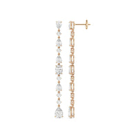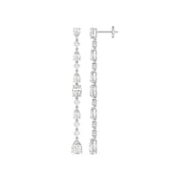 The earrings are designed to make a statement with their long, cascading design. The different diamond shapes like pear and rounds are arranged in a visually striking pattern, creating an elegant and unforgettable look.