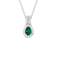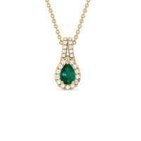 The refined elegance of this gemstone pendant allows you to elevate the look of any outfit in an instant. The pendant features a Pear Shape Emerald on its center framed by a classic halo of lab-grown diamonds. A diamond-studded split bale holds the halo-wrapped colored gem.
