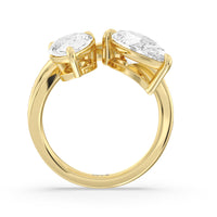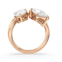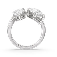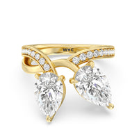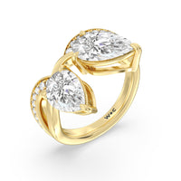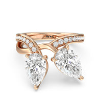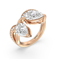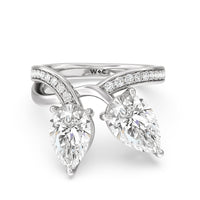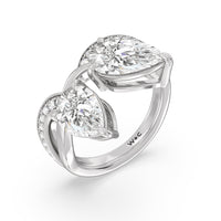 Here is an engagement ring designed with a strong, modern, and edgy look, finished with a romantic story to tell. This unconventional stunner features a vine-like shank characterized by diamond-traced curved shoulders, one of which leads to a brilliant pear-cut diamond. A polished ribbon that stems from one of the glittering shoulders holds another pear-cut diamond. The pear diamond duo visually showcases the coming together of two individuals as a couple.