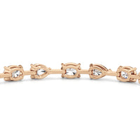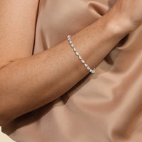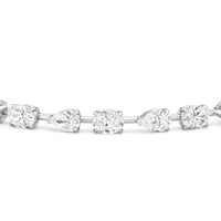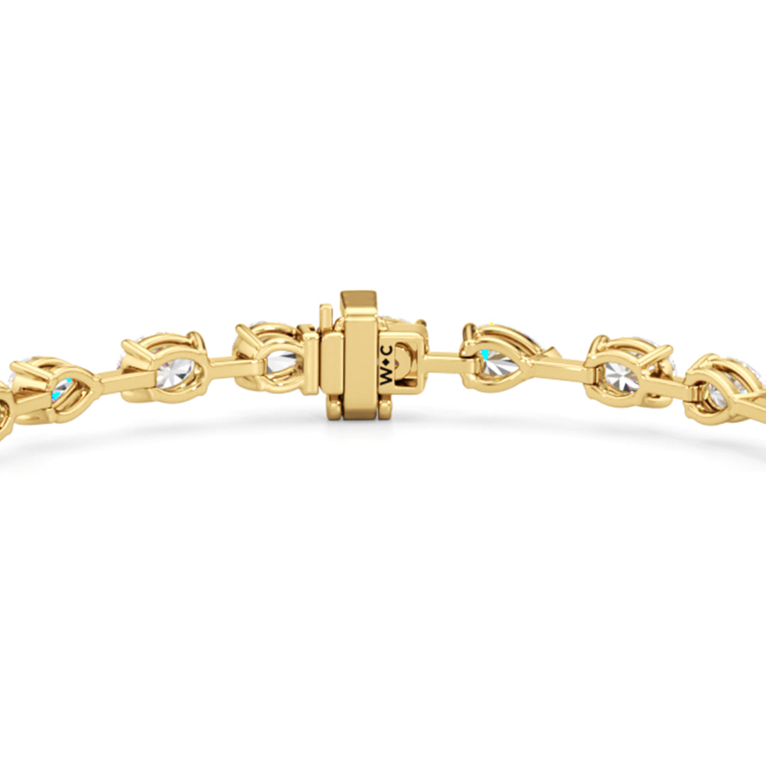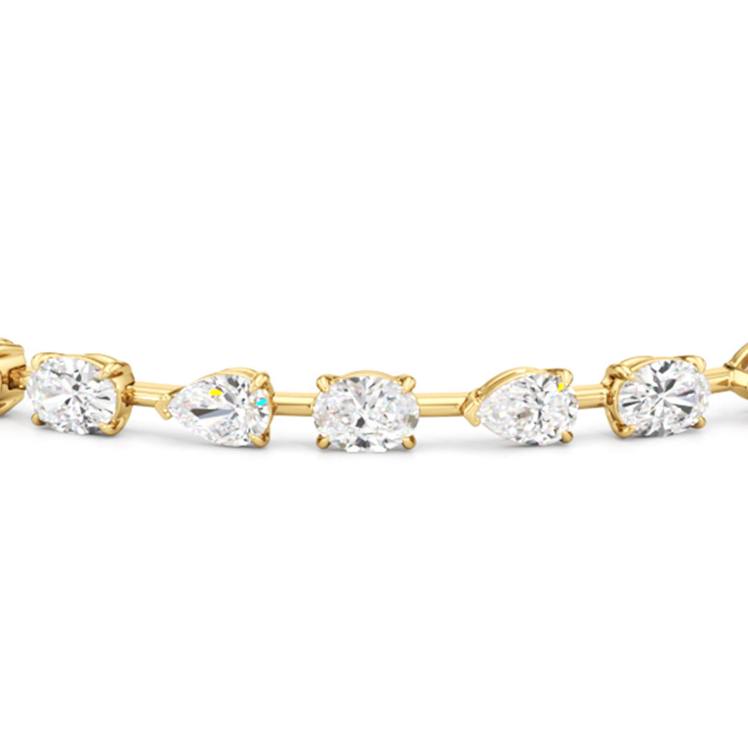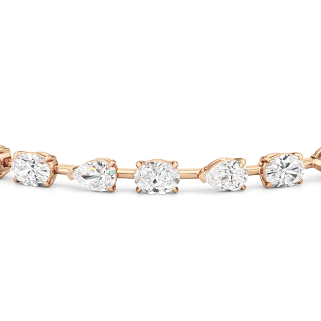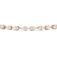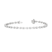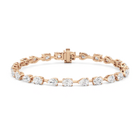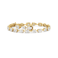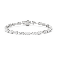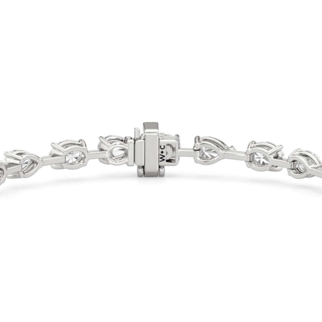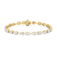 This diamond bracelet's allure is all about order and balance. It is designed with an alternating pattern of pear and oval-cut diamonds, with each gem carefully set on a claw-prong basket. The space between each diamond allows light to hit each stone from all angles.