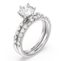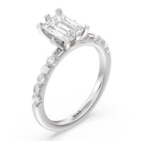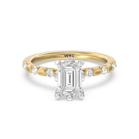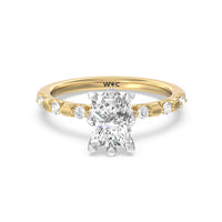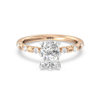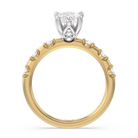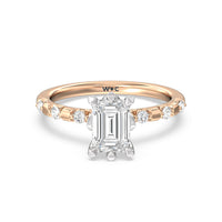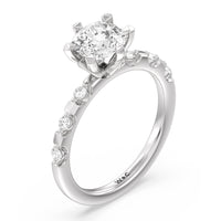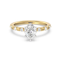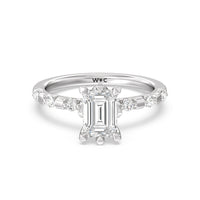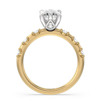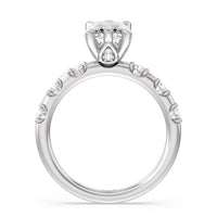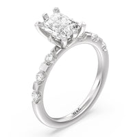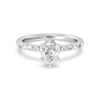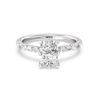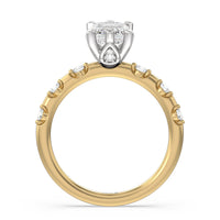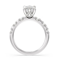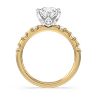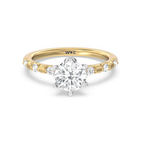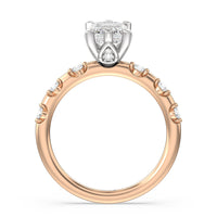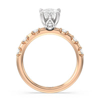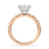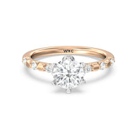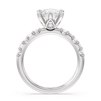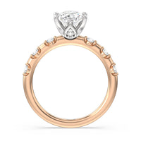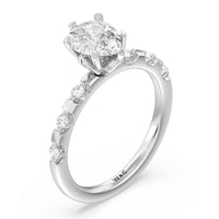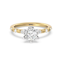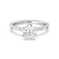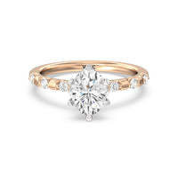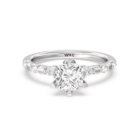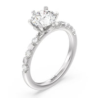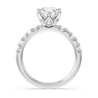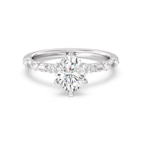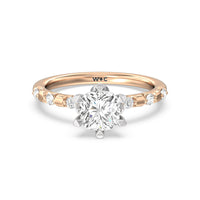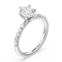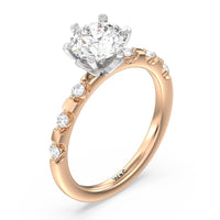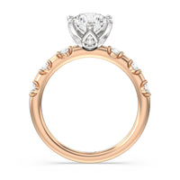 This stunning nature inspired engagement ring features a petal shaped hidden accent design, interspaced diamonds along the shank, reminiscent of dew drops glistening. The center stone is encased within our modern signature 6 claw setting.