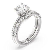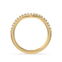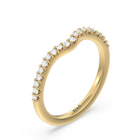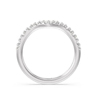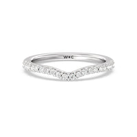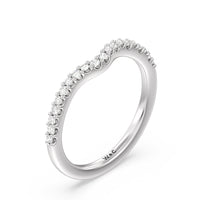 This curved diamond set wedding band is perfectly contoured to complement our petal hidden accent pave engagement ring for a simple and sophisticated look.