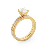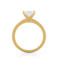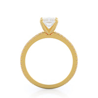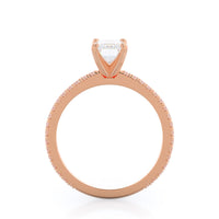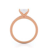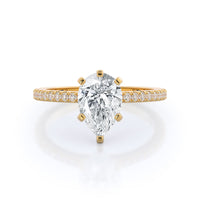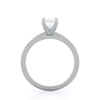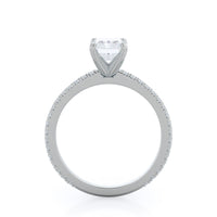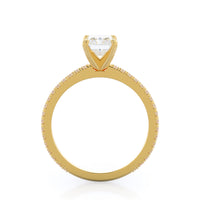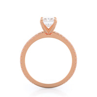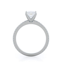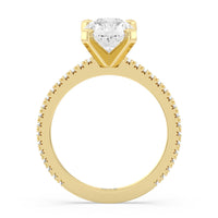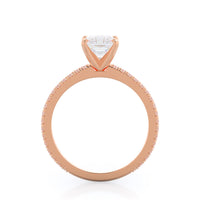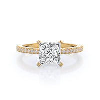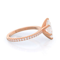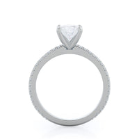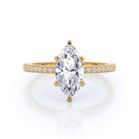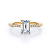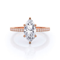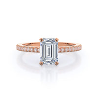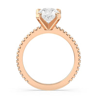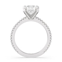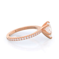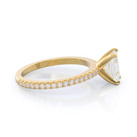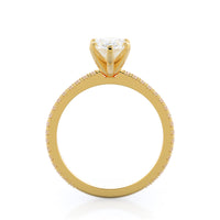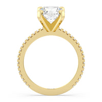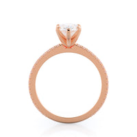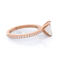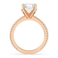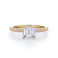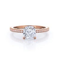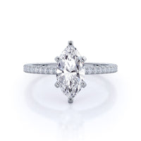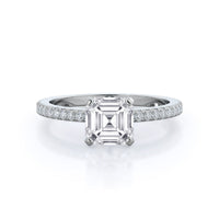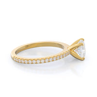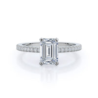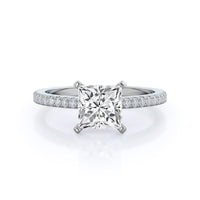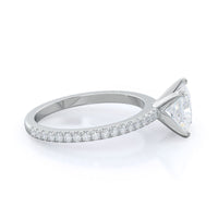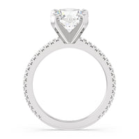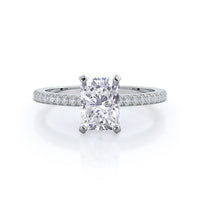 A graceful engagement ring design is set with French set diamond accents for an artful finish.