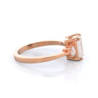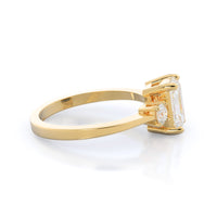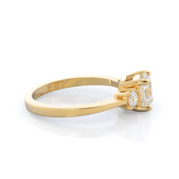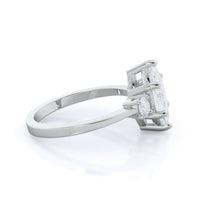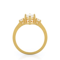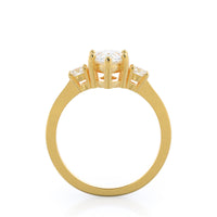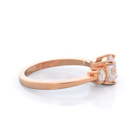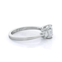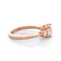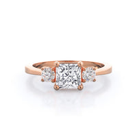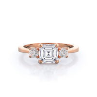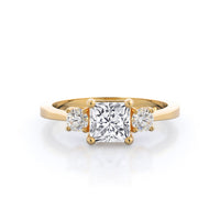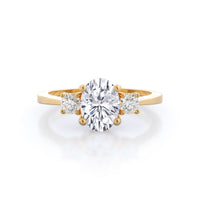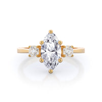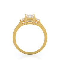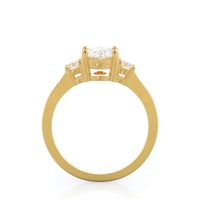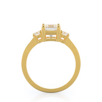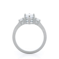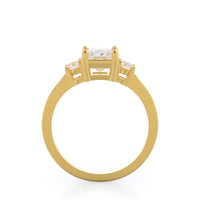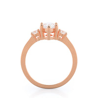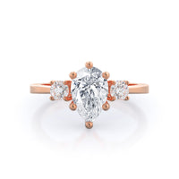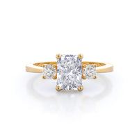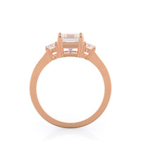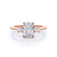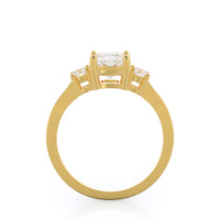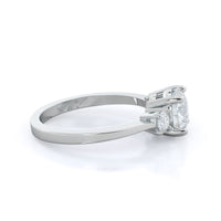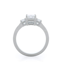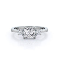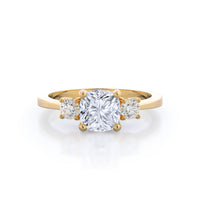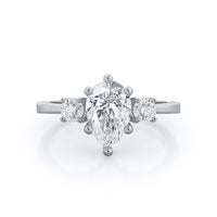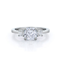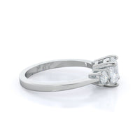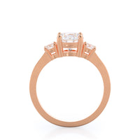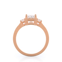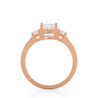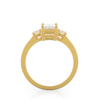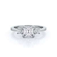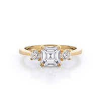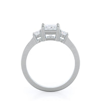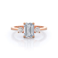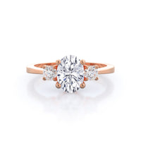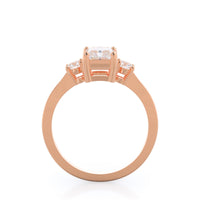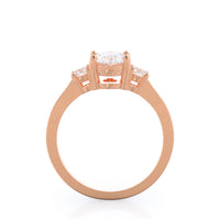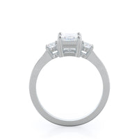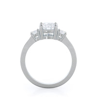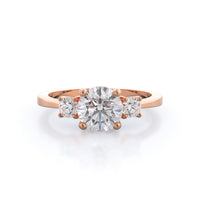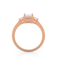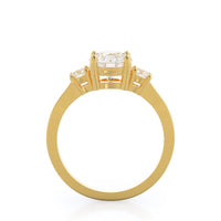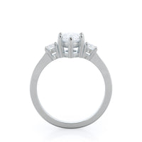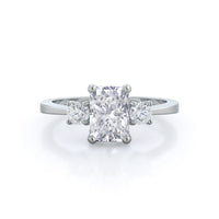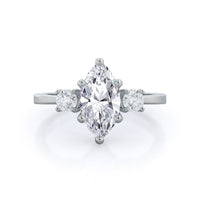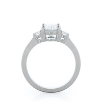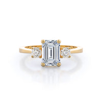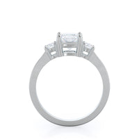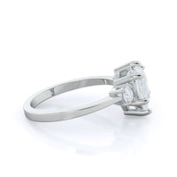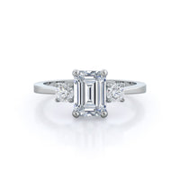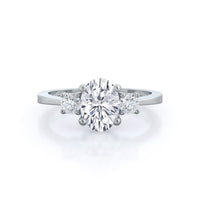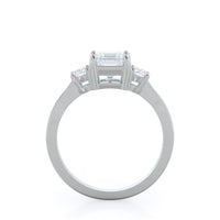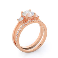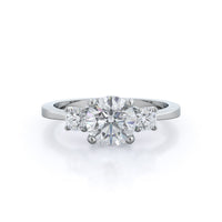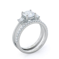 A classic three stone style perfectly accentuated the center diamond. With a petite band, the style is perfect for a center diamond of any size.