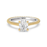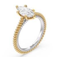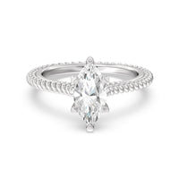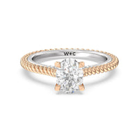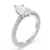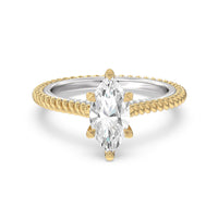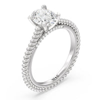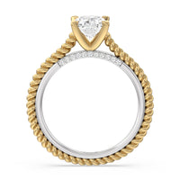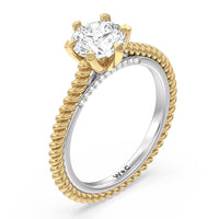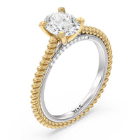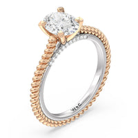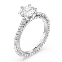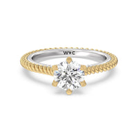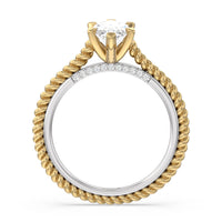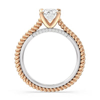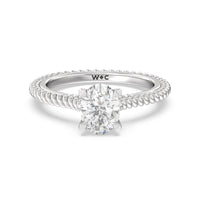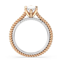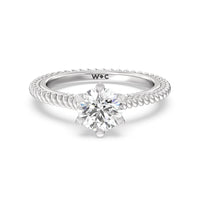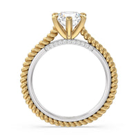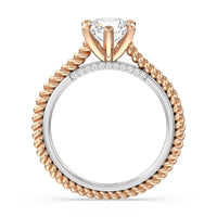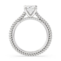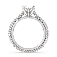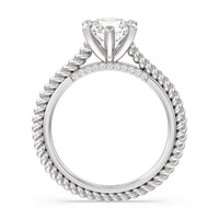 The petite band showcases a graceful woven rope detail to represent the deep emotional connection between two people in marriage. Surprise diamonds adorn the inner ring while six claw prongs secure the center stone in lustrous light.