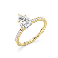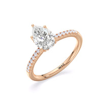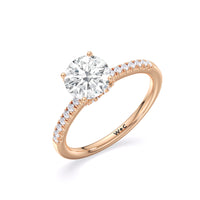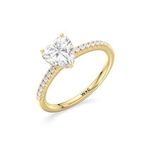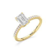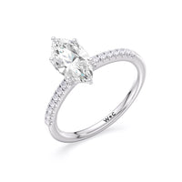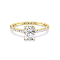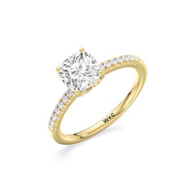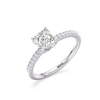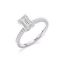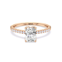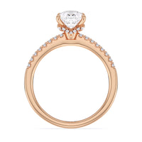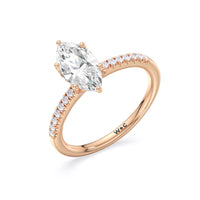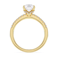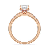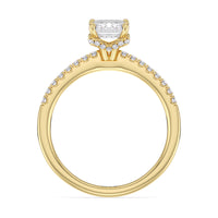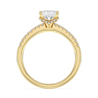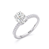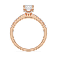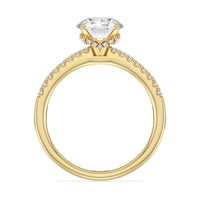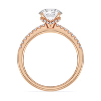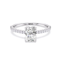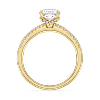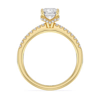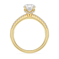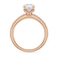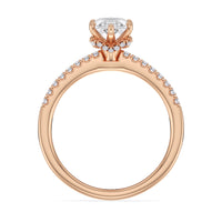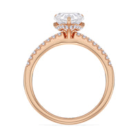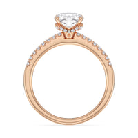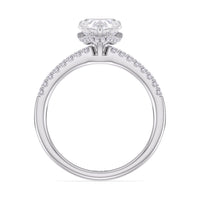 This sophisticated engagement ring features our signature arc hidden halo design along with a diamond pave band to highlight the center stone perfectly! A modern take on a classic style.