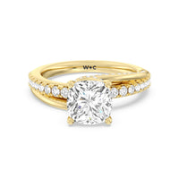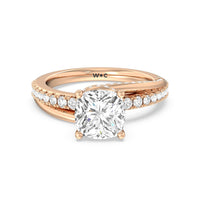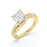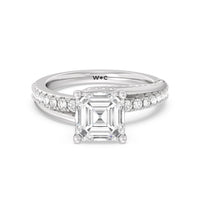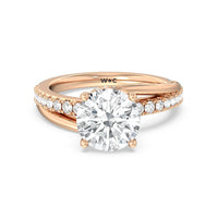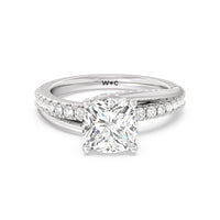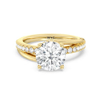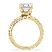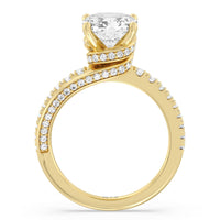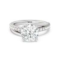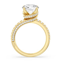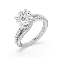Break the mold with this bold and non-traditional diamond engagement ring. This luxe sparkler features a diamond-pavéd shank topped with a remarkable 3-carat diamond center stone. Encircling the base of the center gem is a spiraling hidden halo that gracefully concludes on opposite side edges of the band's shoulders.