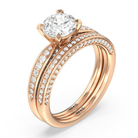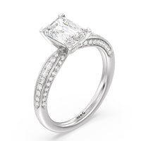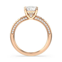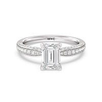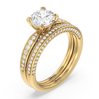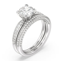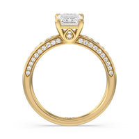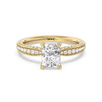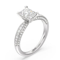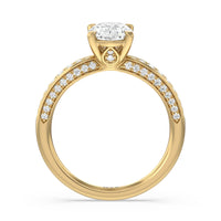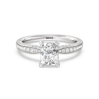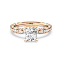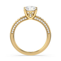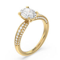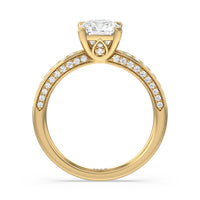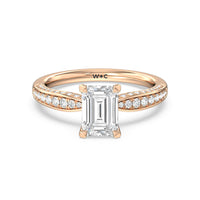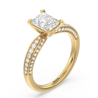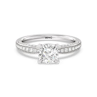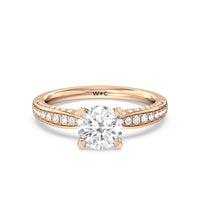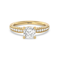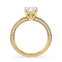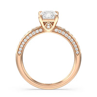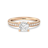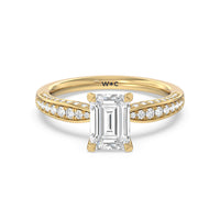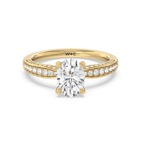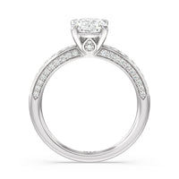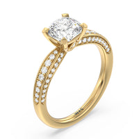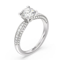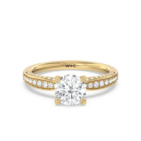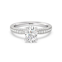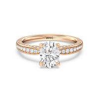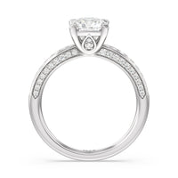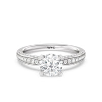 A sparkler displaying the perfect combination of enduring and enchanting. This solitaire has its main gem complemented by a full dose of glitter. The prong head has diamond accents on its side while the shank has its shoulders channel-set with round diamonds, running along all three outer sides.