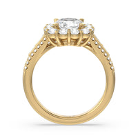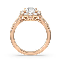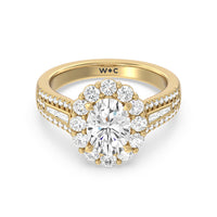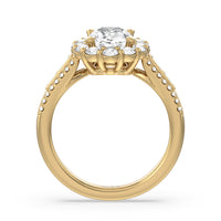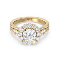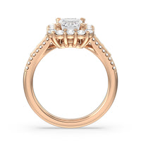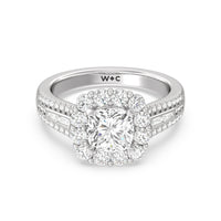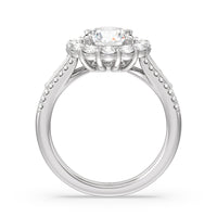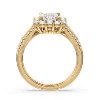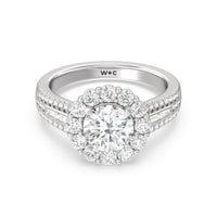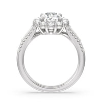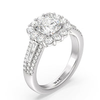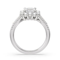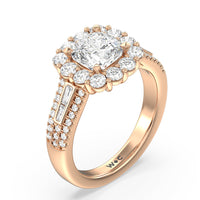A mesmerizing ring embodying a dream come true. Let her know she is the one through this engagement ring. The high-polished tapered band features a slimmer shank that widens as its leads up to the diamond center stone with a floral halo. The shoulders come with three rows of round diamonds, with pairs of baguette-cut diamond accent stones for immense sparkle.