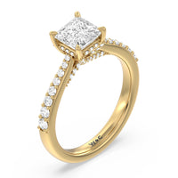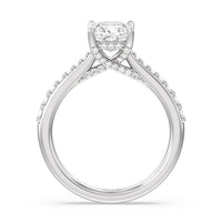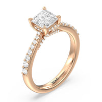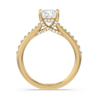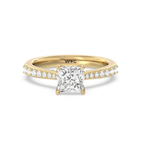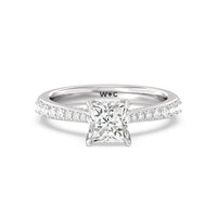 A sparkler of this caliber will make your partner say "Yes!" This ring has an elegant band studded with round diamonds on its subtly arching shoulders. The central diamond is set high on a bridged basket encrusted with more diamonds. The brilliant shine of this ring will surely make your beloved's heart flutter.