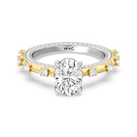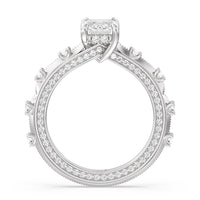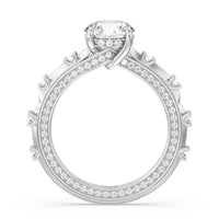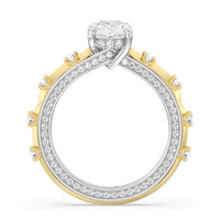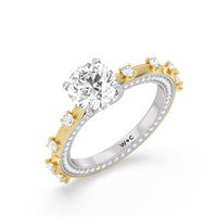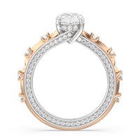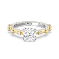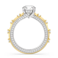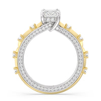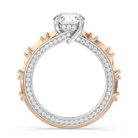 For something a little bit unique, opt for this stand-out engagement ring. This two-toned ring features a knife-edge outer shank with ridged spine detail and prong-set round diamonds positioned in evenly-spaced "stations." The inner shank features a diamond-studded chevron hoop that crosses over the V-shaped prong basket that secures the central diamond. Unconventional in style and appeal, this beautiful ring is the perfect choice for a modern bride.