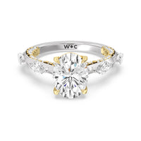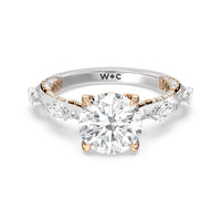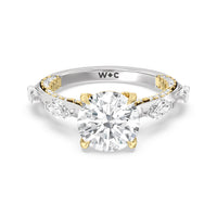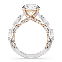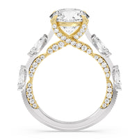 Here is a dazzling engagement ring designed with the intention to cut through mediocrity. This beautiful two-toned piece features a round center stone on a four-prong bezel in a metal tone different from the shank. The prong basket that secures the central gem is traced with diamonds that cascade in a scalloped pattern along the inner shank. To further make this piece shine, the band's arching shoulders are punctuated with a pair of marquise-cut diamonds mounted on evenly-spaced stations.