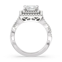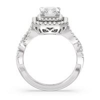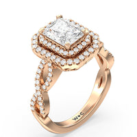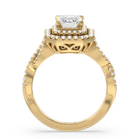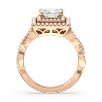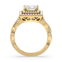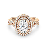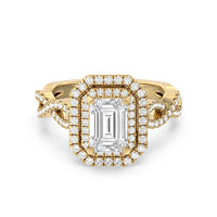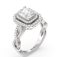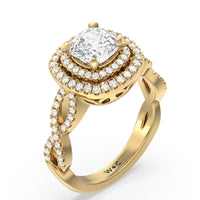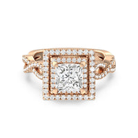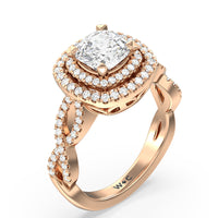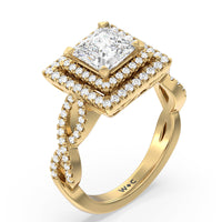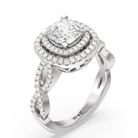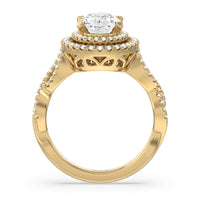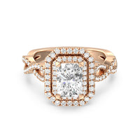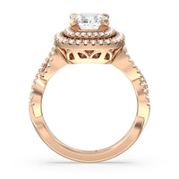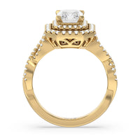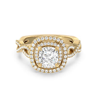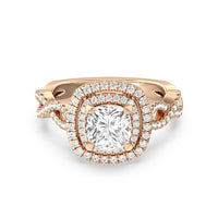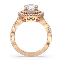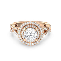An astounding double halo beauty, this ring has all it takes to be a perfect choice for engagement. The twinkling solitaire is encircled by two rows of sparkling diamonds that adds to its shine. The interlaced pave shank enhances the beauty of this ring further.