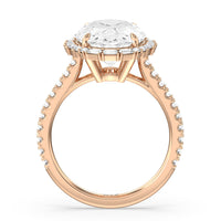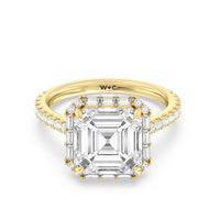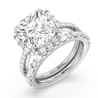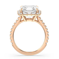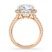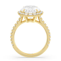 This diamond engagement ring will appeal to a bride-to-be who prefers tradition with a little bit of glitz and glamour. This cathedral band has its raised shoulders pave-set with round diamonds. They lead to a dazzling diamond center stone framed by a halo of baguette-cut diamonds.