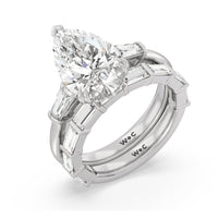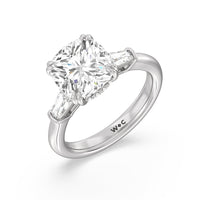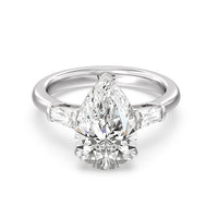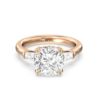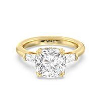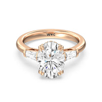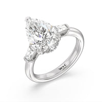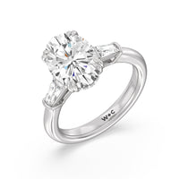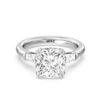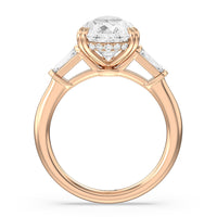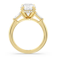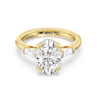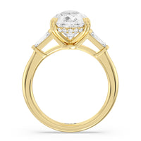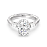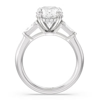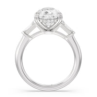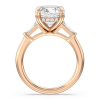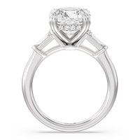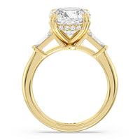 This 3-stone engagement ring embodies quiet luxury with its understated elegance. A diamond center takes the spotlight, set in a three-prong claw prong basket that enhances its brilliance. Adding dimension and refinement, baguette side stones in a sleek bar setting flank the center stone for a chic, sophisticated finish. A hidden halo of petite round diamonds ensures a radiant glow from every angle. The rounded shank offers a comfortable yet timeless appeal, making this a luxury engagement ring that represents the past, present, and future of your love story.