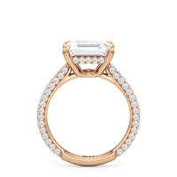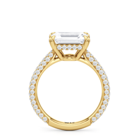 Dazzle her with the enchanting refinement of this luxury diamond engagement ring. This design showcases a center diamond securely mounted in a 4-prong double claw basket with a glittering hidden halo, ensuring brilliance from every angle. The cathedral shank's arching shoulders are adorned with a triple row of diamonds, elegantly cascading three-fourths of the way around the band. A dome pavé shank enhances the rings radiance, offering a balance of grandeur and quiet luxury. This hidden halo engagement ring defines sophistication is finished with claw prongs for a refined touch.