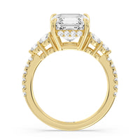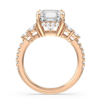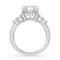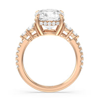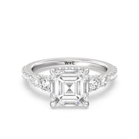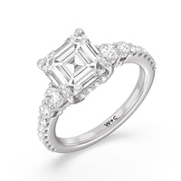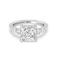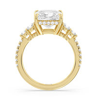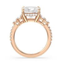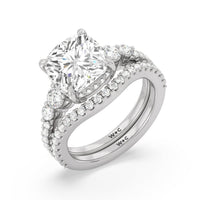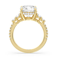Designed with attention to detail, this sparkling marker of love and commitment shines with dreamlike beauty. The ring displays subtle elegance with its cushion-cut centerstone set high on a four-prong basket with a glittering hidden halo. The tapering round diamond side stones lead to the shank's shoulders that are further traced with brilliant gems.