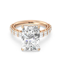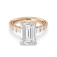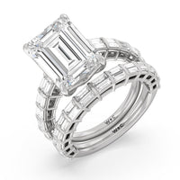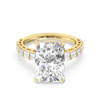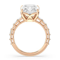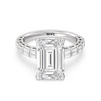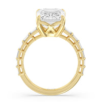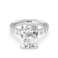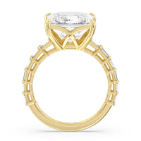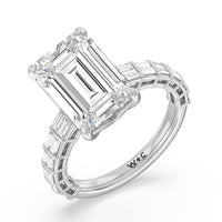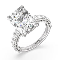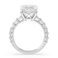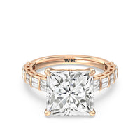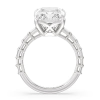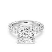 Here is one ring that speaks volumes in its luxurious yet conservative design. It features a polished shank that broadens and arches ever so slightly as it approaches the majestic princess-cut center diamond. The band's shoulders are traced with baguette-cut diamonds that also gently and gradually increase in size as it nears the central gem.