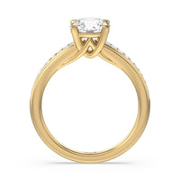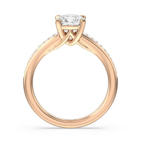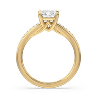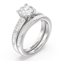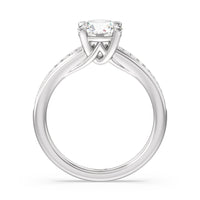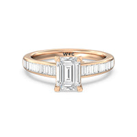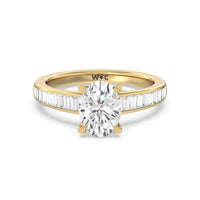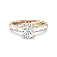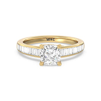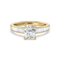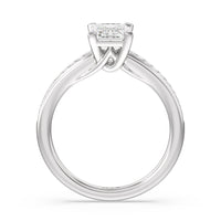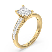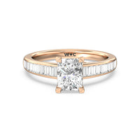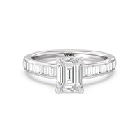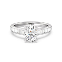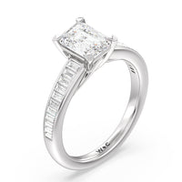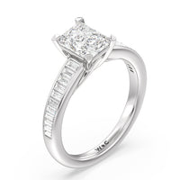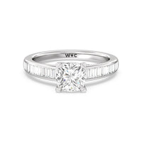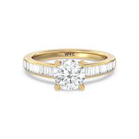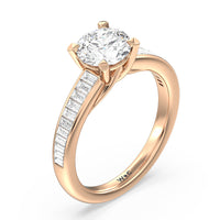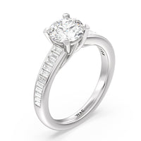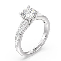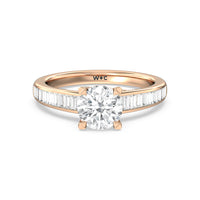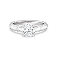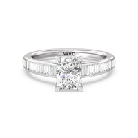 Designed with a dose of glamour, this diamond engagement ring charms with its non-stop sparkle. Its glittering center stone is held by four prongs and accented by baguette-cut diamonds in a channel setting. A graceful band with a strand that curves up to form the prong holding the center diamond adds allure to this piece.