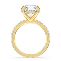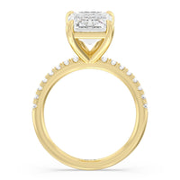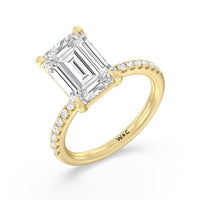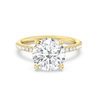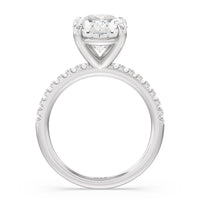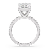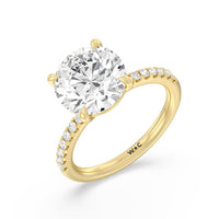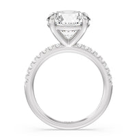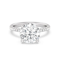 An exceptional choice for engagement, this ring holds a 5-carat diamond center stone that immediately and irresistibly draws the eye. The central stone is secured by four claw prongs. Fourteen diamonds line the band's shoulders for a spectacular finish.
