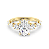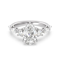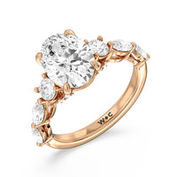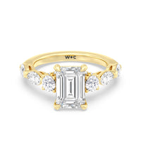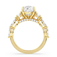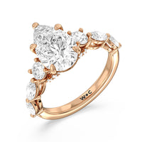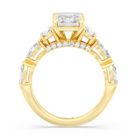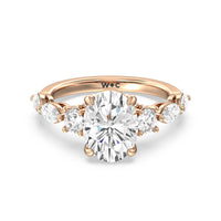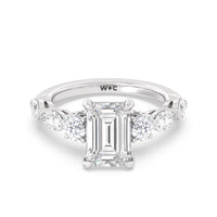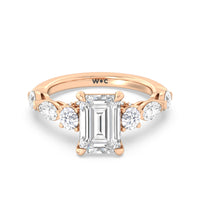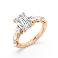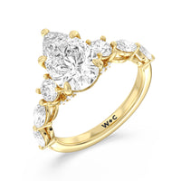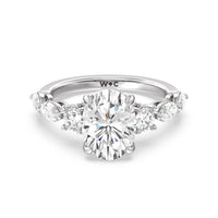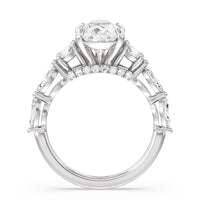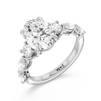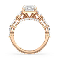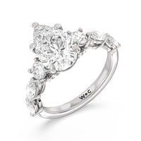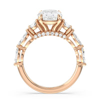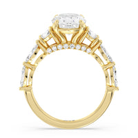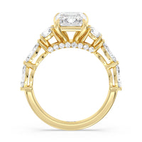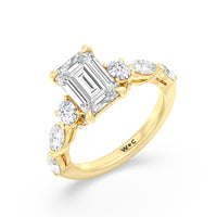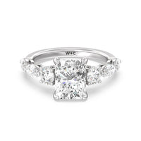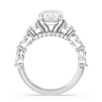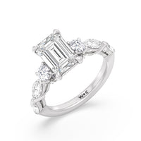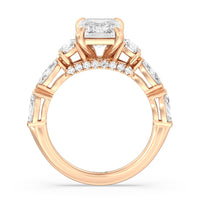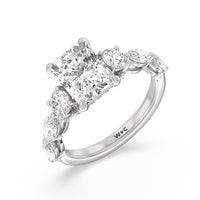 Designed for the fashion forward bride to be, this engagement ring impresses with its studded band adorned with fancy cut diamonds. The ring's diamond lined shoulders are sculpted to follow the shape of the side stones that lead to a shimmering lab grown central diamond. The bridge is marked by smaller round diamonds for added sparkle.