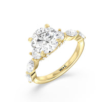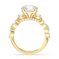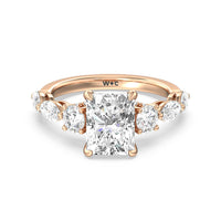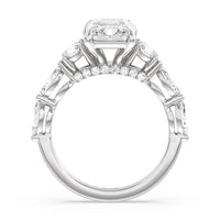 Designed for the fashion forward bride to be, this engagement ring impresses with its studded band adorned with fancy cut diamonds. The ring's diamond lined shoulders are sculpted to follow the shape of the side stones that lead to a shimmering lab grown central diamond. The bridge is marked by smaller round diamonds for added sparkle.