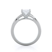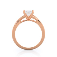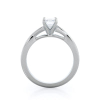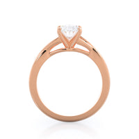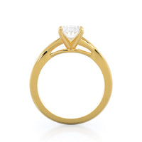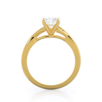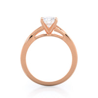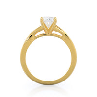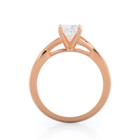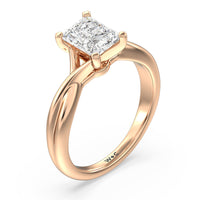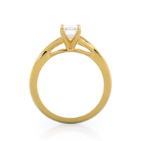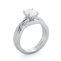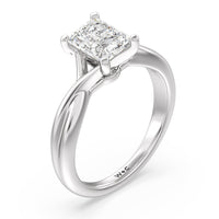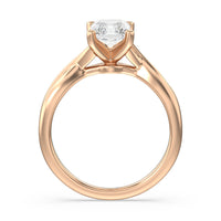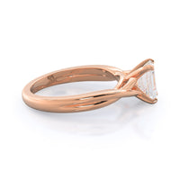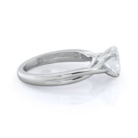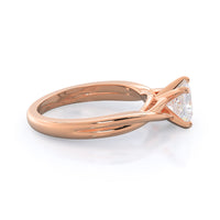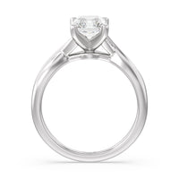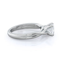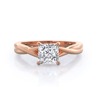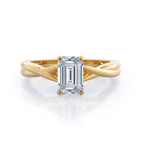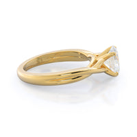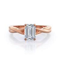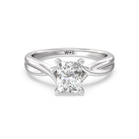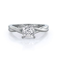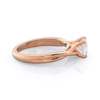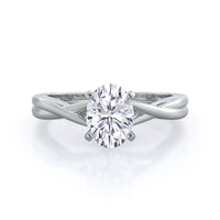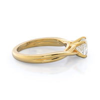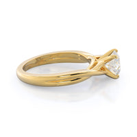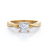 A traditional cathedral head cradles the diamond of the ring to let more light hit and accentuate the diamond. The twisting band adds another element of style.