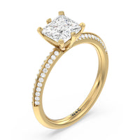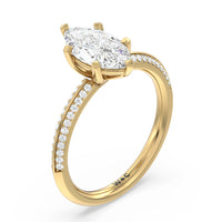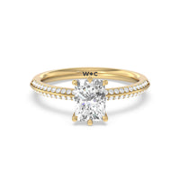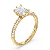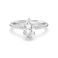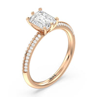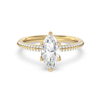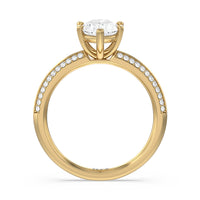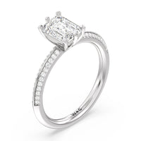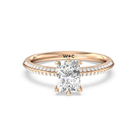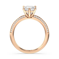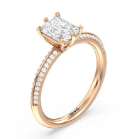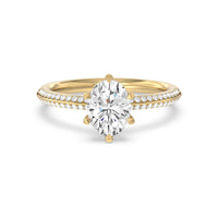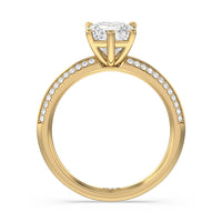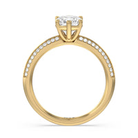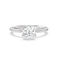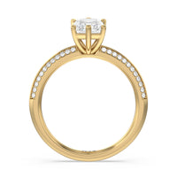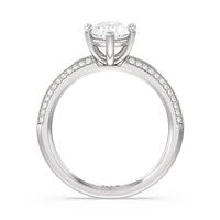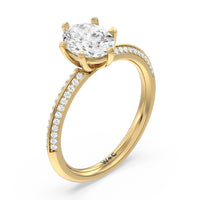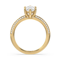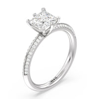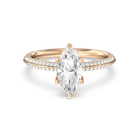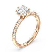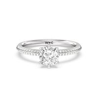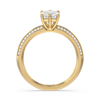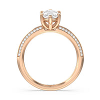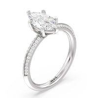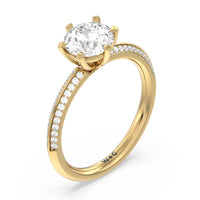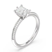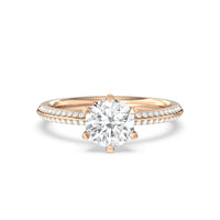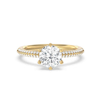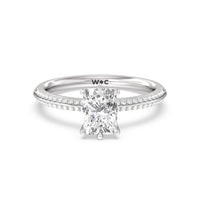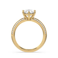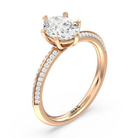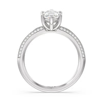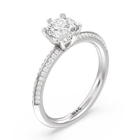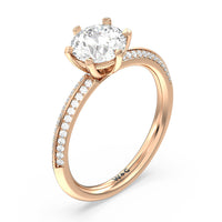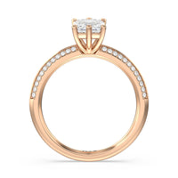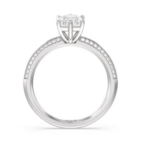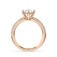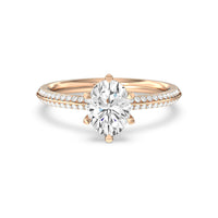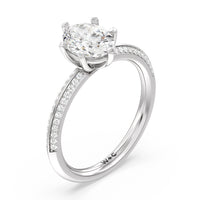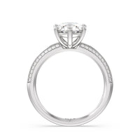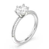 This pave set knife-edge engagement ring is our contemporary rendition of a classic style. Sloping edges form a subtle meeting point creating an elegant silhouette with minimalist appeal. The 6 claw setting creates a modern frame to your diamond.
