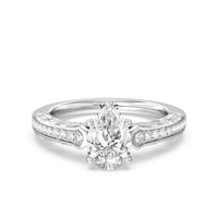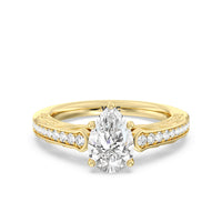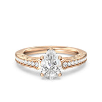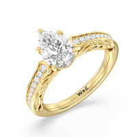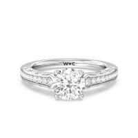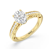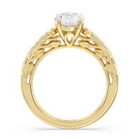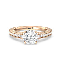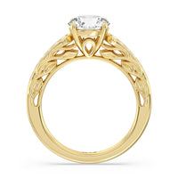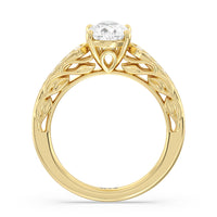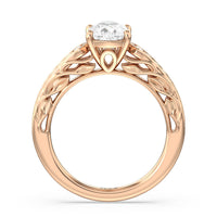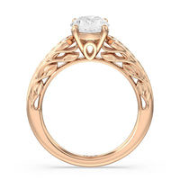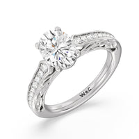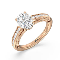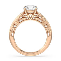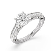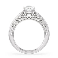 What better ring to mark and celebrate your love than a ring that suggests "entwined lives." This diamond engagement ring features a vine-inspired gallery that signifies two paths crossing and becoming one. The ring has a slender shank with pave-set diamond side stones and a marvelous central diamond raised high on a four-prong basket setting.