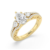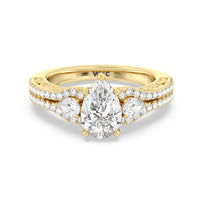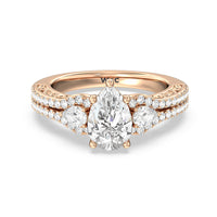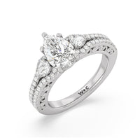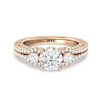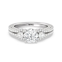 Designed with beauty that harkens back to another time, this is the kind of ring a lover of all things vintage will appreciate. This retro-inspired engagement ring features a split shank with petite diamonds tracing the parting shoulders. Beautiful scroll-pattern cut-outs decorate the gallery for that touch of vintage romance.
