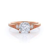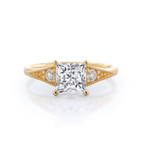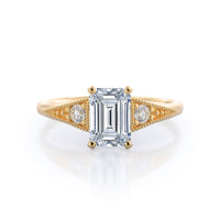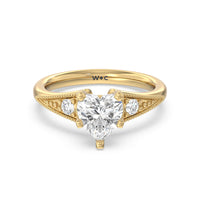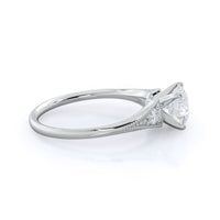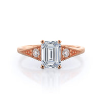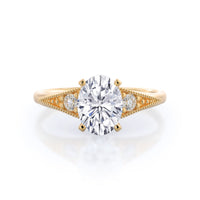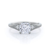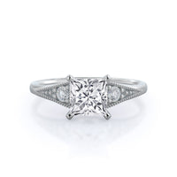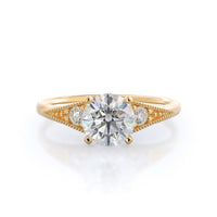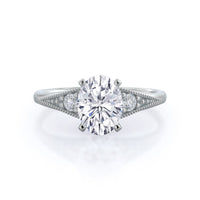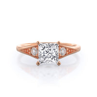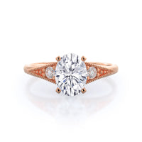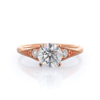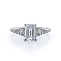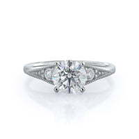 Combining both sparkle and intricate metalwork this ring has two large accent diamonds totaling that flank the center diamond. Metalwork adds character to the ring.
