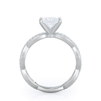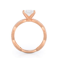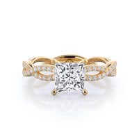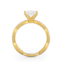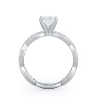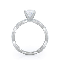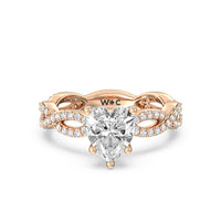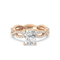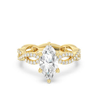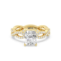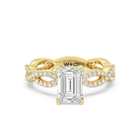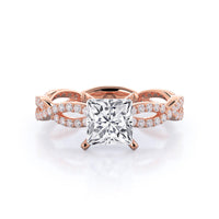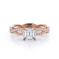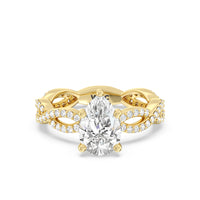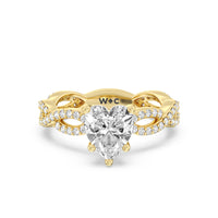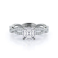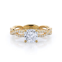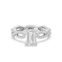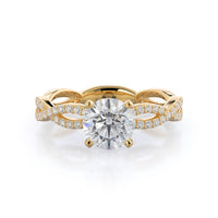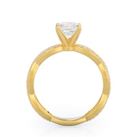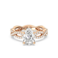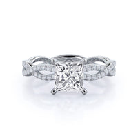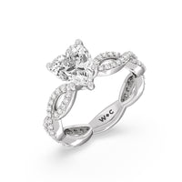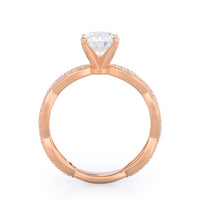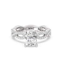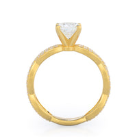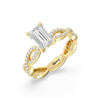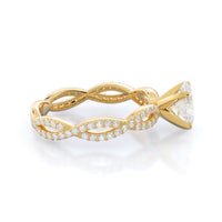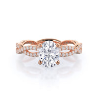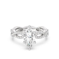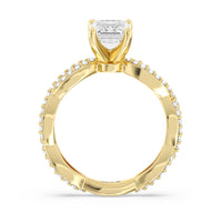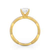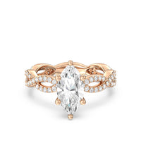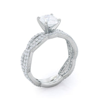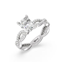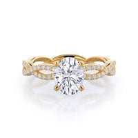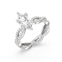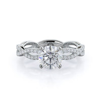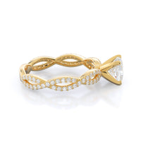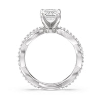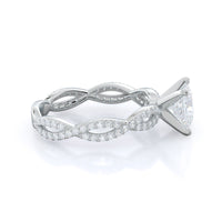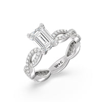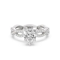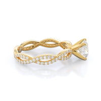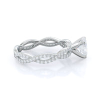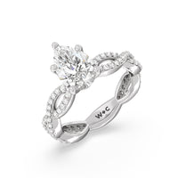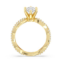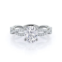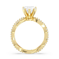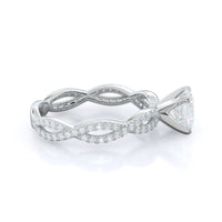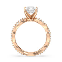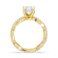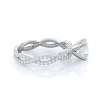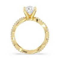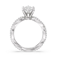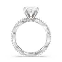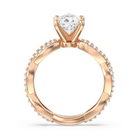 A winding curved setting features pave set accent diamonds that wrap all the way around her finger.