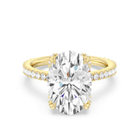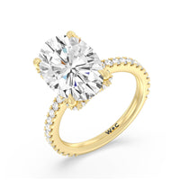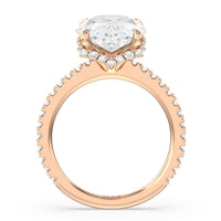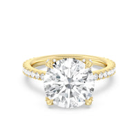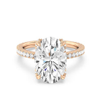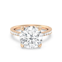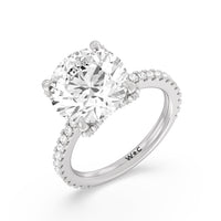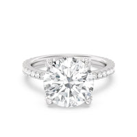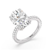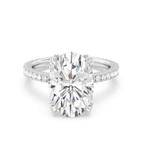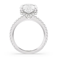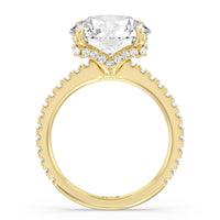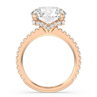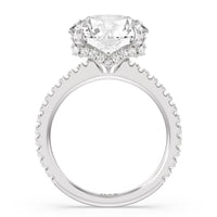 This statement-making engagement ring is designed to deliver a lot of light and sparkle to the hand. It has a 6-carat diamond center stone cradled by four prongs. Tiny diamonds in pavé setting run more than halfway around the band. A V-shaped hidden halo elevates the ring's design and wow factor.