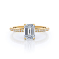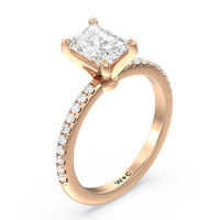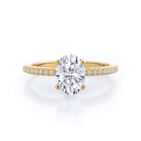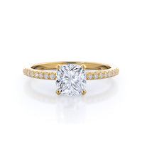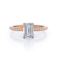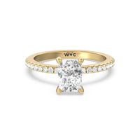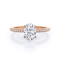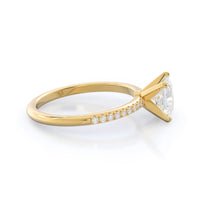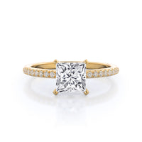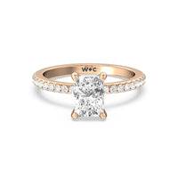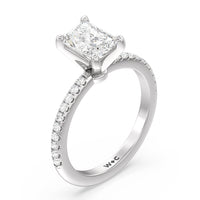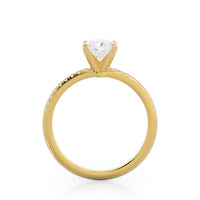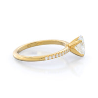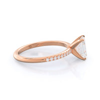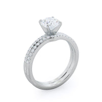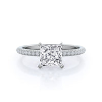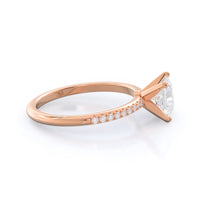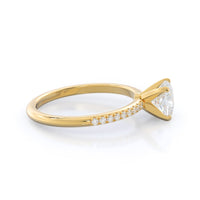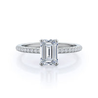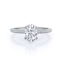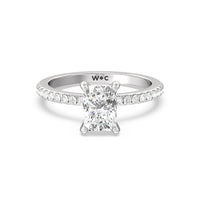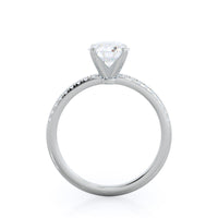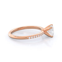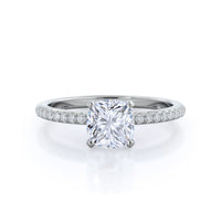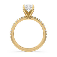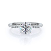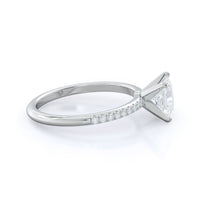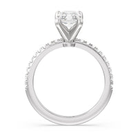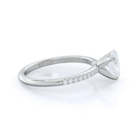 18 round accent diamonds are pave set within this ring for a sparkling yet minimalistic look. The band showcases the sparkle of the center diamond and the accent diamonds while minimizing the appearance of the metal.