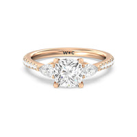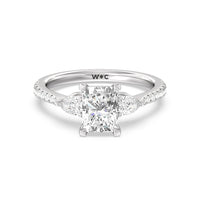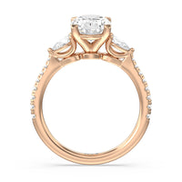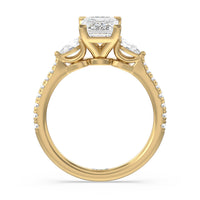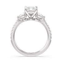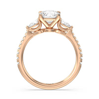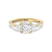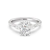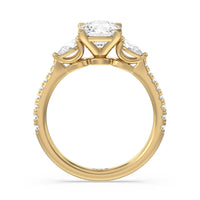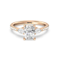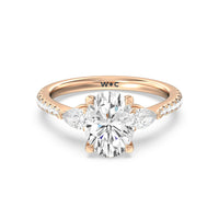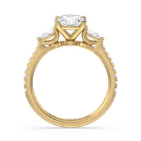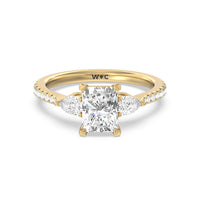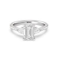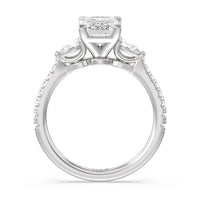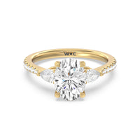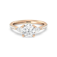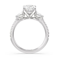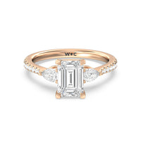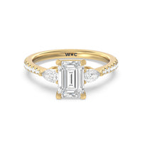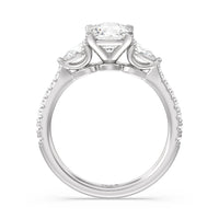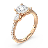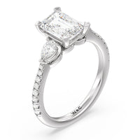 Three stones are better than one and this piece proves it. A gorgeous center diamond is framed by pear-shaped diamond side stones complemented by pave accent diamonds on the ring's shoulders. The slightly tapered band gives this gorgeous jewel of love an unexpected finish.
