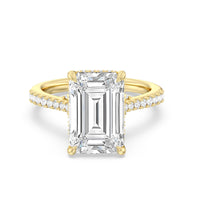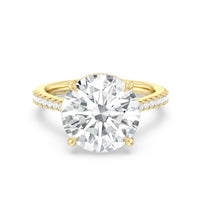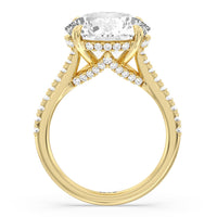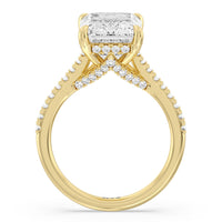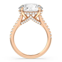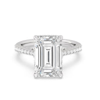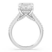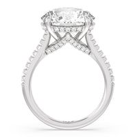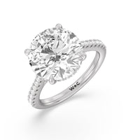 This diamond engagement ring evokes a sense of nostalgia while looking current and trendy. It has a cathedral shank where the arched shoulders are traced with round diamonds. Set high above the band is a showy 7-carat diamond center stone secured by four prongs with a diamond-encrusted rail. Supporting the central gem is an angular bridge dotted with more diamonds for that unexpected sparkle.