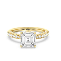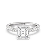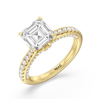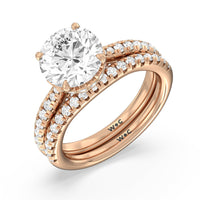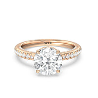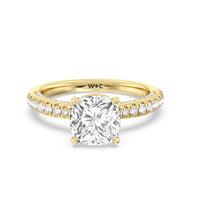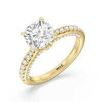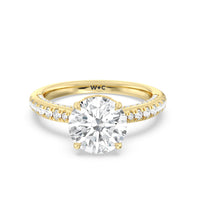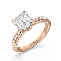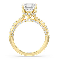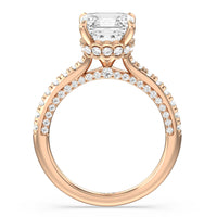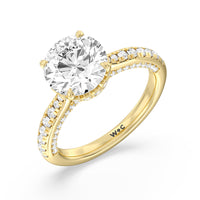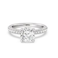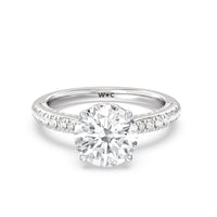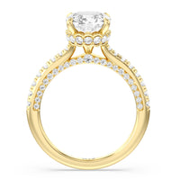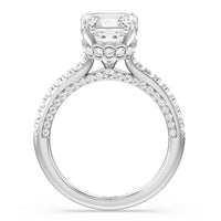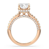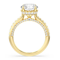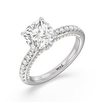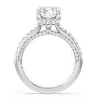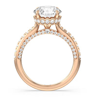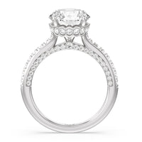 With multidimensional sparkle, this engagement ring is perfect for the glamorous, fashion-forward bride-to-be. The shank's arching shoulders are meticulously traced with diamonds, complemented by a diamond-embellished bridge. Underneath the stunning central diamond is a circular band of more petite round diamonds - a hidden halo - ready to deliver an extra dose of glitter.