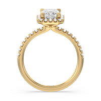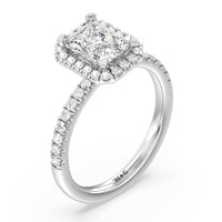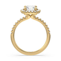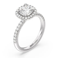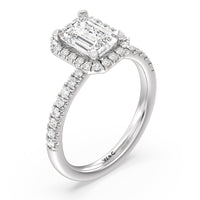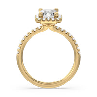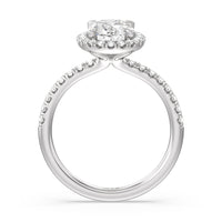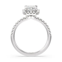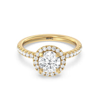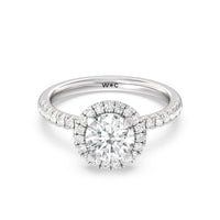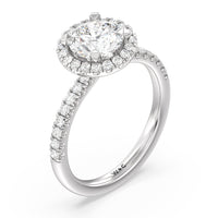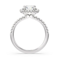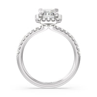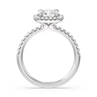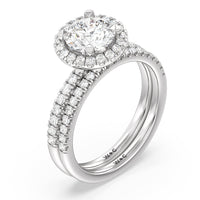 As endless as your love is the sparkle of this engagement ring. On a polished band is a diamond center stone surrounded by a no-gap halo of even more diamonds. For added glitter and shine, round diamond side stones flow half of the way around the band.
