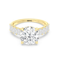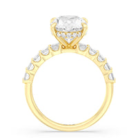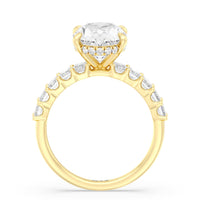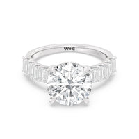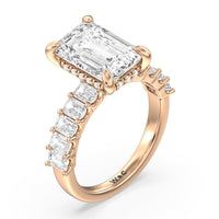 There is no shortage of glitter in this engagement ring. The band features emerald-cut accent diamonds that make a sophisticated style statement. The sparkle from the step-cut side stones complements the central diamond that sits high above the band. A hidden halo of round diamonds encircles the main stone's girdle for shimmering elegance that's sure to turn heads.