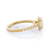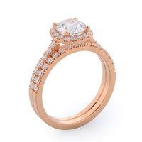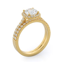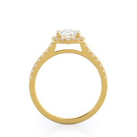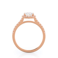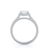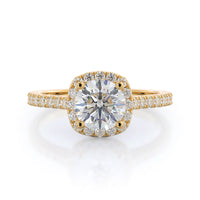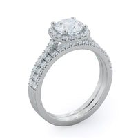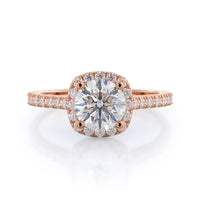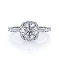 A rounded square halo cradles the center diamond with 28 round accent diamonds. The rounded halo provides a unique and contemporary take on the traditional round halo. Stones are pave set for an elegant finish.