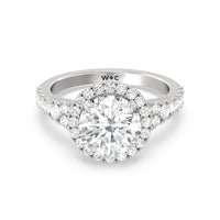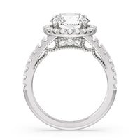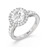 The perfect choice for the vintage-loving bride-to-be. This ring features a diamond center stone embraced by a distinct and morous halo of smaller round diamonds. More brilliant white diamonds run along the band'stapering shoulders. View the ring from the side to see the ornate diamond-punctuated and milgrain-detailed gallery that gives the ring its rich character.