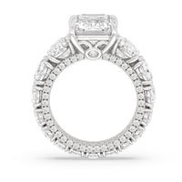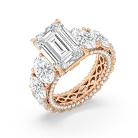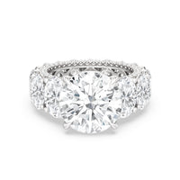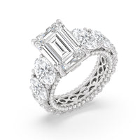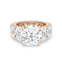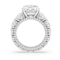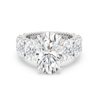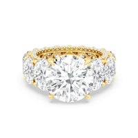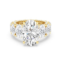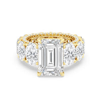 This engagement ring encapsulates the richness of your love story. It boasts a stunning diamond center stone, in a round, oval, or emerald cut. Boosting the sparkle of the central gem are 14 oval diamonds in tapering sizes, covering the entire circumference of the band. A bezel-set peek-a-boo round diamond dot the base of the claw prong setting that raises the center stone. Surrounding the ring's inner perimeter are prong-set round diamonds for a remarkable glow.