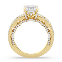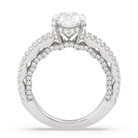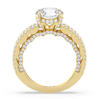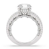 An incredibly shiny diamond ring that brings classic and modern together effortlessly. This stunner features a row of diamonds on its shoulders framed by milgrain edges. The milgrain-detailed prong basket secures a center diamond that delivers major sparkle. A view from the side showcases the intricate beauty of a scalloped bridge that brings a romantic touch to this engagement ring.