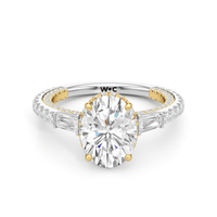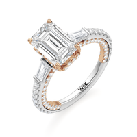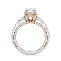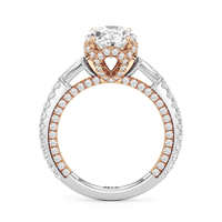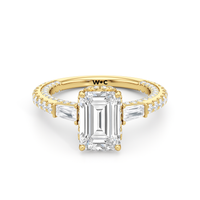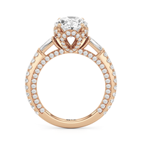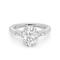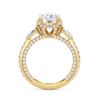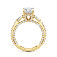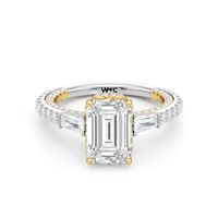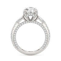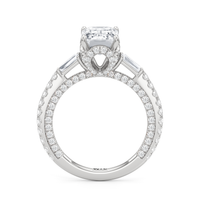Boasting a radiant three stone silhouette, the ring is crowned with center stone flanked by baguette side stones and pave round diamond shank. The center stone is nestled in the signature diamond-adorned, petal-inspired basket of the Chrysler collection. The ring is a classic beauty with shimmering floral details and diamonds that adorn the front view.