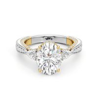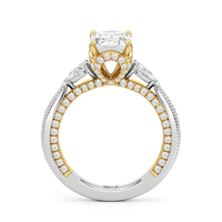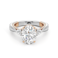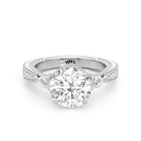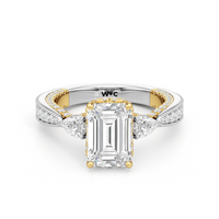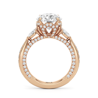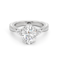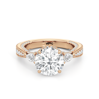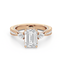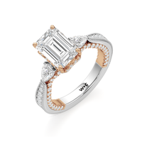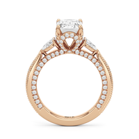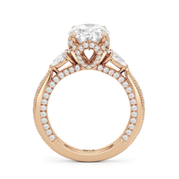 The Chrysler Pear Three Stone Ring features milgrain pavé shoulders studded with shimmering pear diamonds that guide your eye to the center cradled in the signature petal basket. The ring is inspired by the confluence of different shapes in perfect harmony merging with art deco.