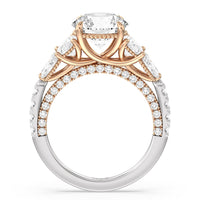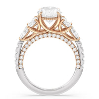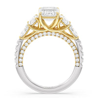 This diamond engagement ring clearly has the romance of the past. It features an ornamental trellis in yellow gold that secures the central diamond and shimmering side stones in place. Diamonds on the bridge and the band's shoulders make the ring shine more beautifully when light hits it.