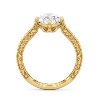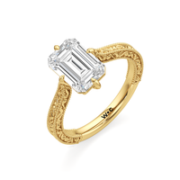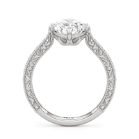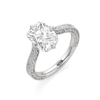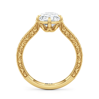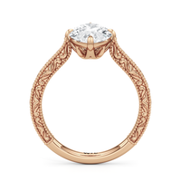 A reverie of vintage elegance, Elodie evokes a memory in lace and light. Its center stone is secured in a striking compass setting atop a sculptural star-shaped basket. The low-profile centerpiece is supported by a tapered shank, adorned with delicate engraving inspired by Art Deco grace.
